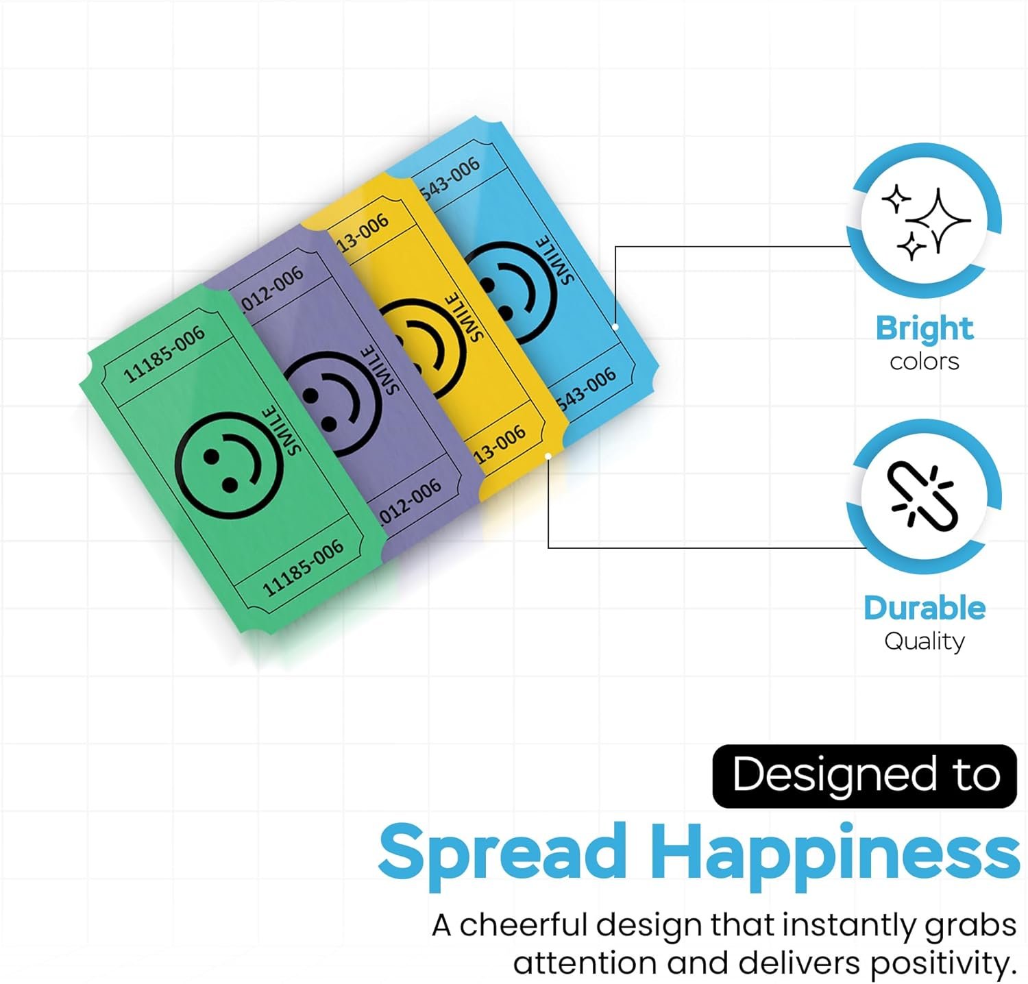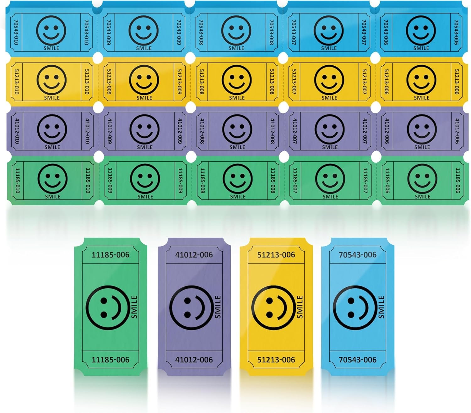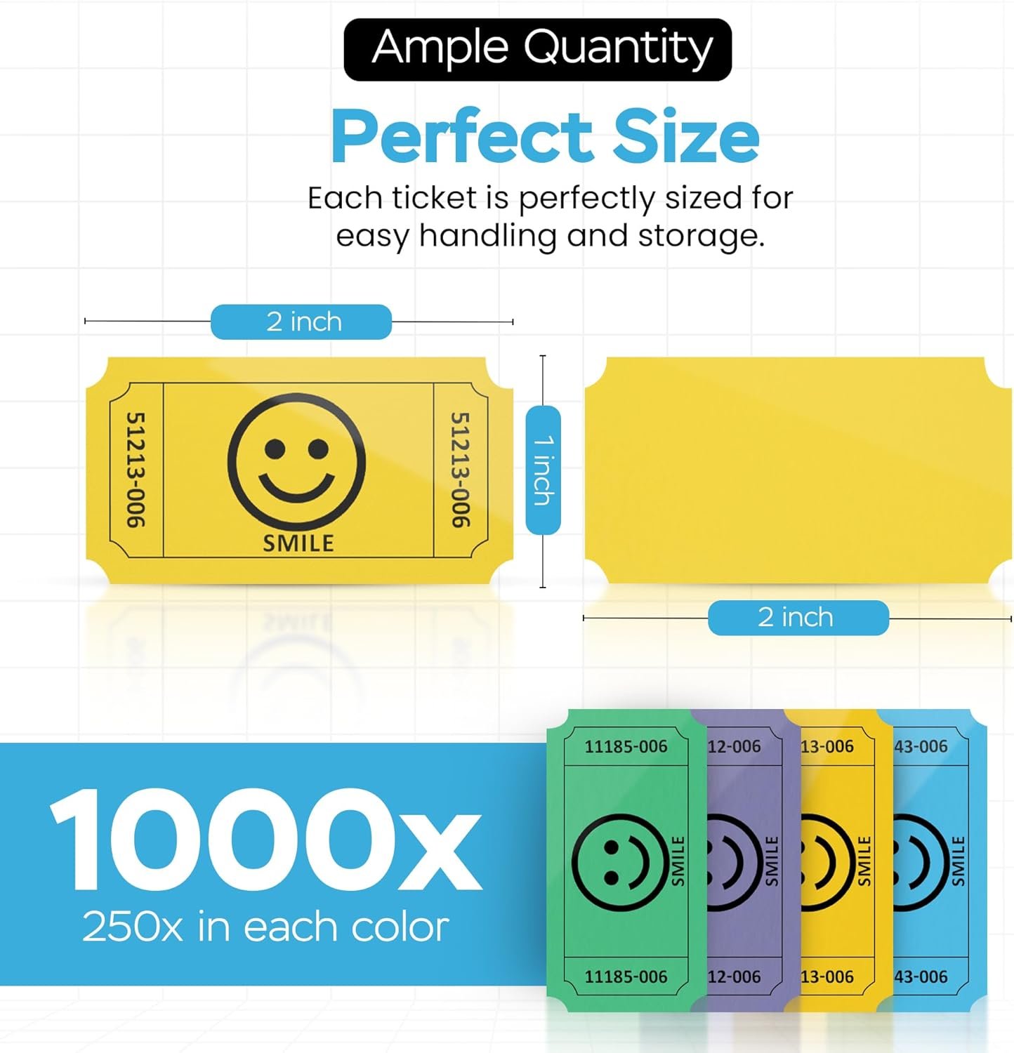 Add fun and organization to any event with these Smile Raffle Tickets – Multicolor Flat Pack. Designed with cheerful smile faces, these tickets come in Blue, Yellow, Purple, and Green, making them easy to sort and perfect for brightening raffles, parties, entry control, and giveaways. This value pack includes single 1,000 total tickets, with 250 tickets of each color, neatly stacked in flat packaging for quick access and easy distribution. Each ticket measures a standard 2 x 1 inches, making them compact, lightweight, and convenient to hand out, collect, and store. All tickets are consecutively numbered, helping keep raffles, drawings, and events organized while ensuring smooth tracking and fair selection. Suitable for a wide range of uses, these smile raffle tickets are ideal for fundraisers, business events, carnivals, birthday parties, showers, exchange vouchers, and more.