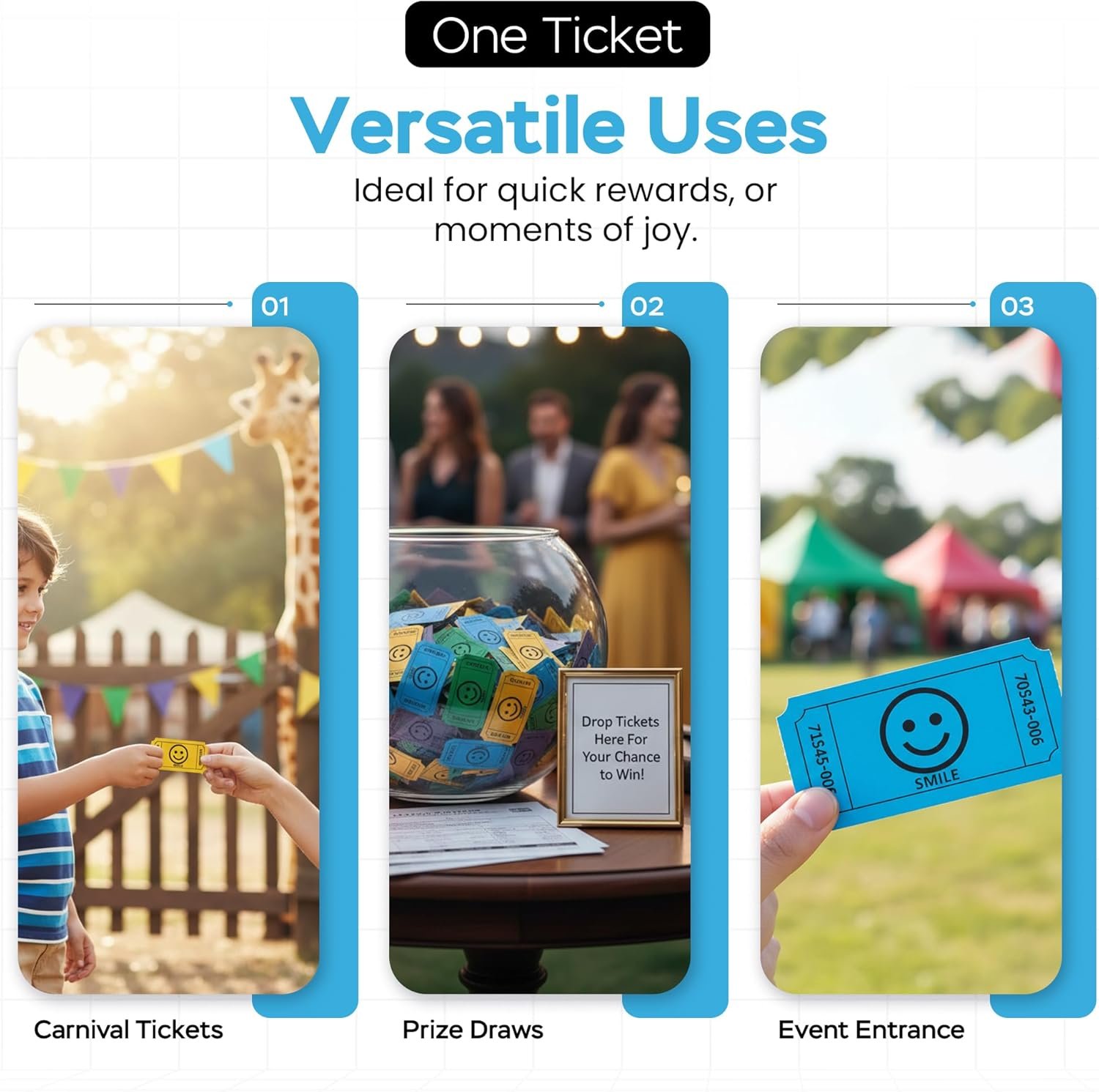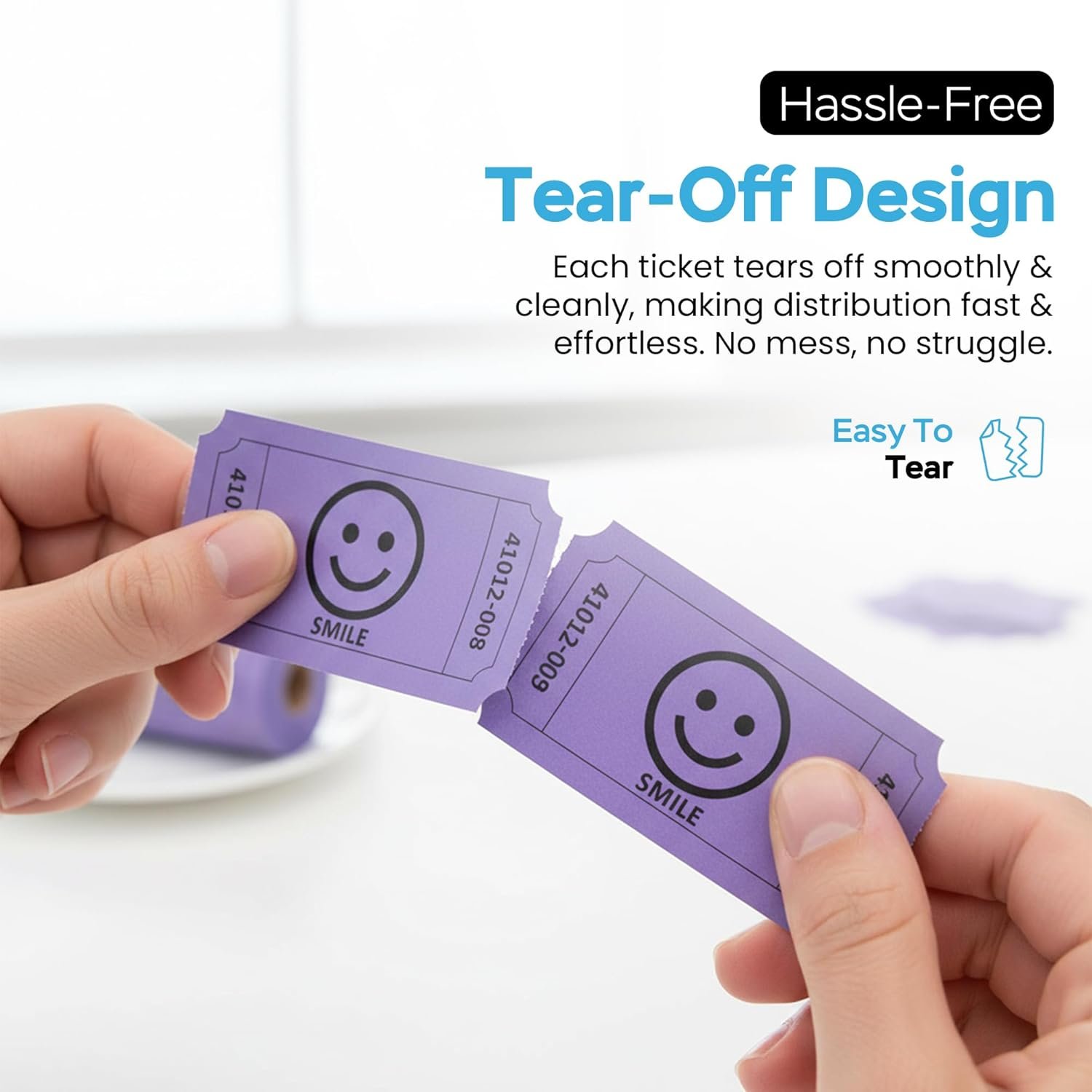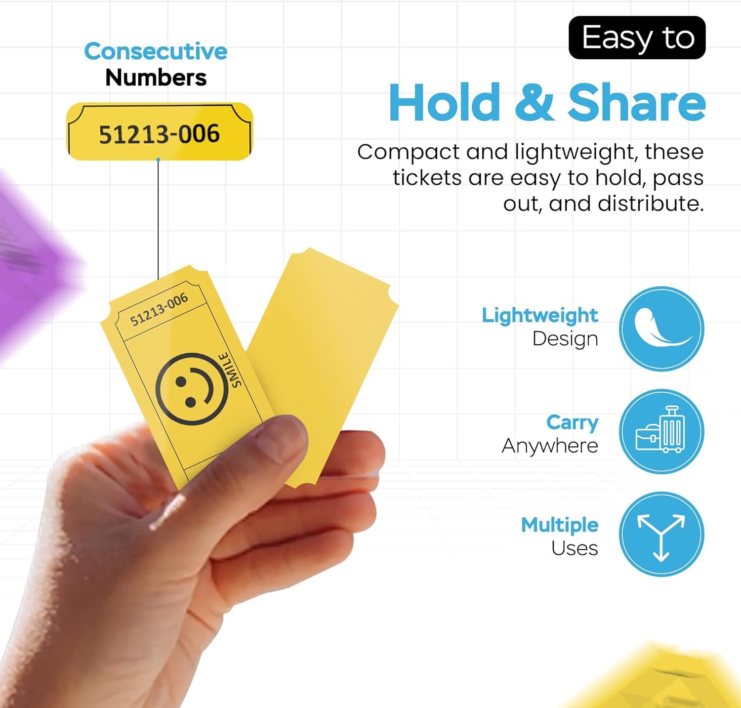Add fun and organization to any event with these Smile Raffle Tickets – Multicolor Flat Pack. Designed with cheerful smile faces, these tickets come in Blue, Yellow, Purple, and Green, making them easy to sort and perfect for brightening raffles, parties, entry control, and giveaways. This value pack includes single 1,000 total tickets, with 250 tickets of each color, neatly stacked in flat packaging for quick access and easy distribution. Each ticket measures a standard 2 x 1 inches, making them compact, lightweight, and convenient to hand out, collect, and store. All tickets are consecutively numbered, helping keep raffles, drawings, and events organized while ensuring smooth tracking and fair selection. Suitable for a wide range of uses, these smile raffle tickets are ideal for fundraisers, business events, carnivals, birthday parties, showers, exchange vouchers, and more.