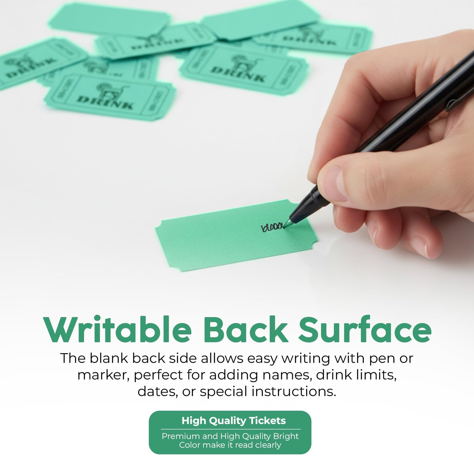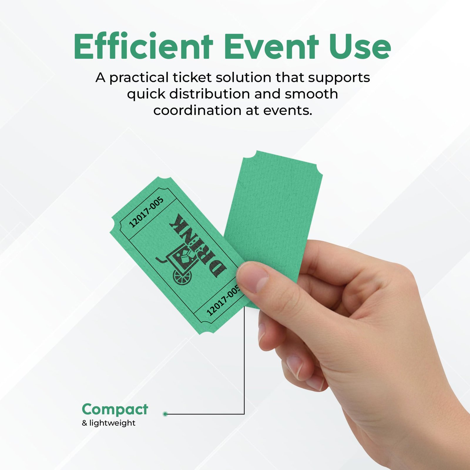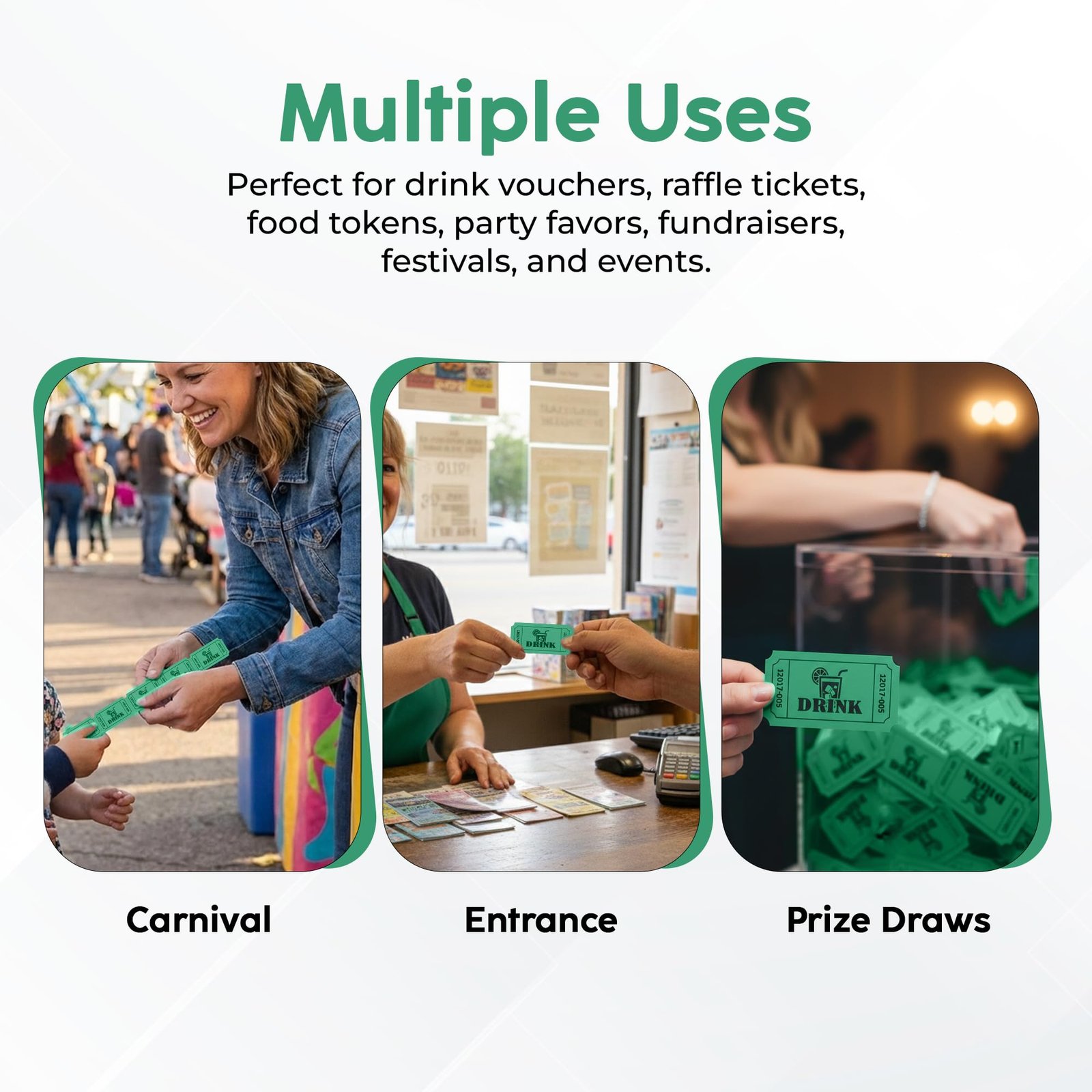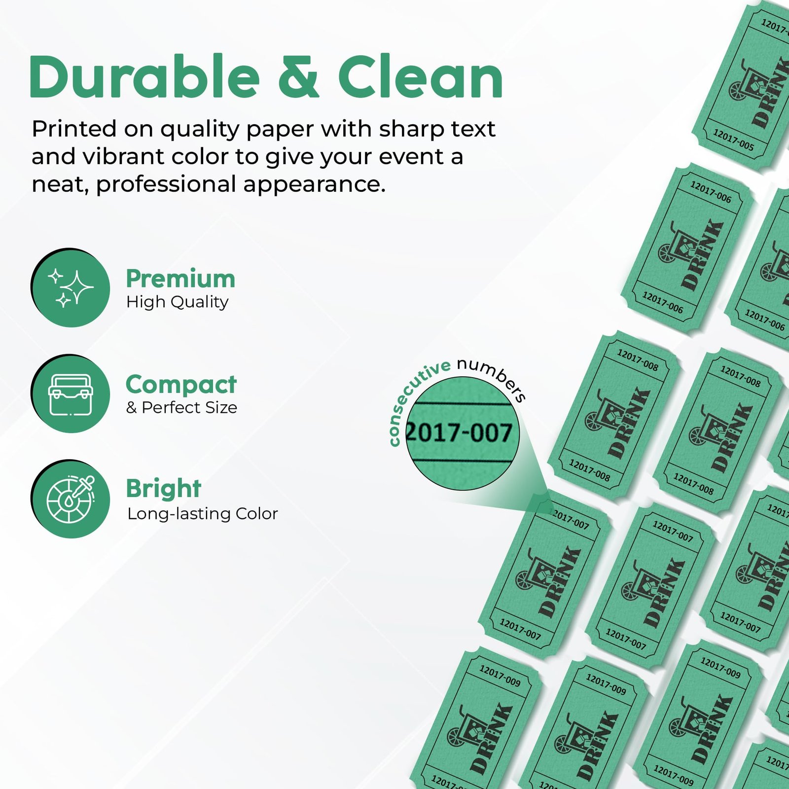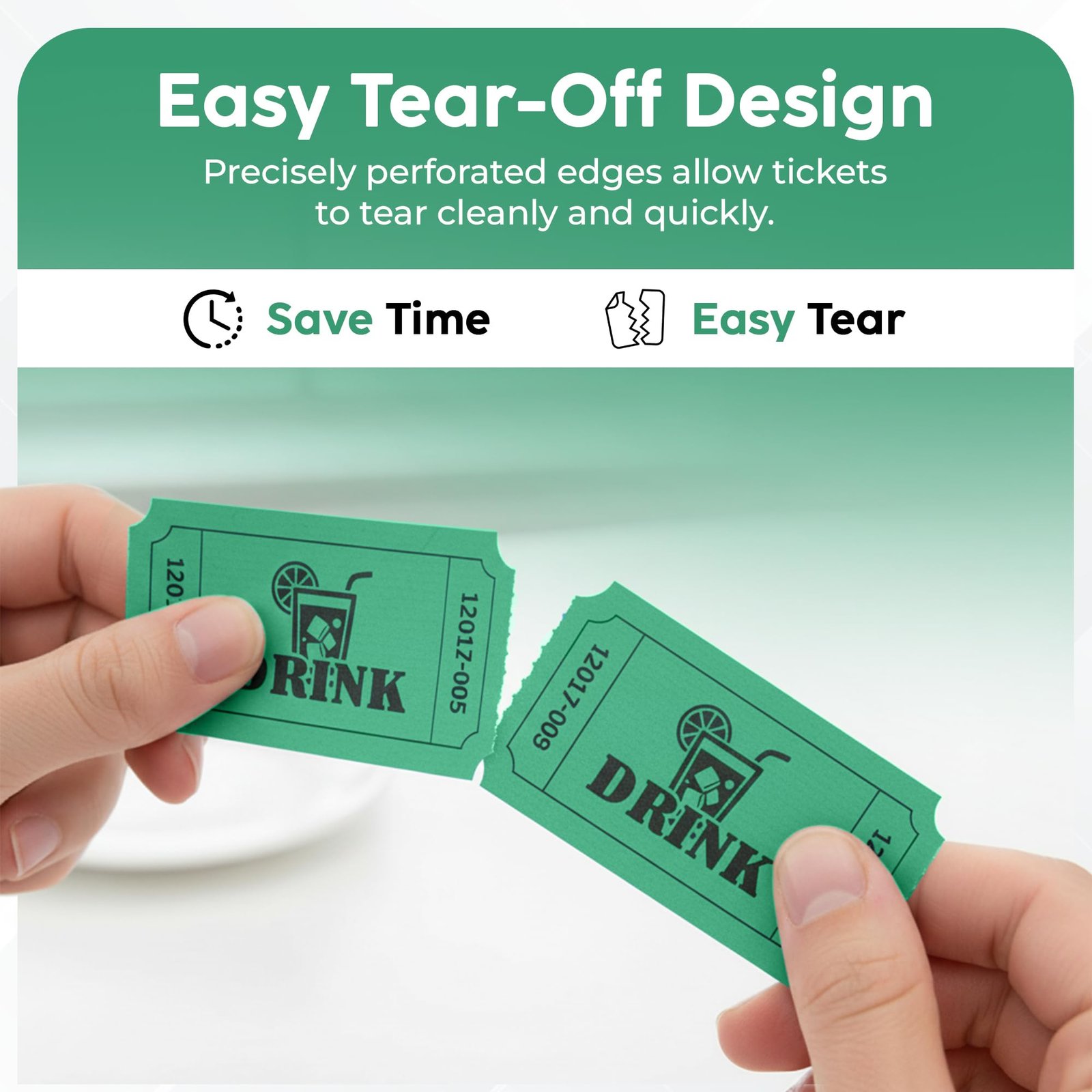 Keep your events organized and fun with these Drink Tickets in bright Green. Perfect for parties, entry control, fundraisers, school events, and more, these tickets make it easy to manage activities while adding a touch of color and excitement.